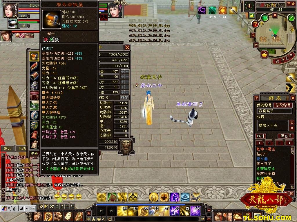开打了,我先放万岳(因为他们可以打怒),跟着抽蓝。然后指点少则,一排技能放光。一个八门定住他后接三阳,(一边打一边很紧张,毕竟是出山后第一架啊)看他血哗哗的掉,而我的血就少了一点点。没技能了,平攻一会,冷却时间过了,又一排技能送他归西了。心里那个爽啊,后来出去后才知道他装备不怎么好,宝石打的不多。后来在较场打过很多次,因为毕竟80多级象我这样装备的还是有限的,所以打架输少赢多,遇到装备跟我差不多的,实力也是相当。但是有一点不得不承认的,同装备同心法天龙确实是属于比较弱的。下面发一下本人的属性图。