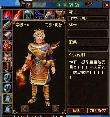 喜喜混混目前是华东电信游坦之神仙居帮会一名猛将,刚荣登90,论装备而言,目前称得上是游坦之第一明教。装备石头全6,坐骑天马。但为人谦虚、低调。采访过程中,和蔼、友善。不失为一名侠客是也。
