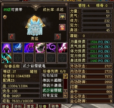 在技能选择上,如果你打了迟钝之类的技能,用高级的就很难被打掉,所以我尝试了几次,觉得打借力、身法、定力等主加属性的技能比较好。比如我那个剑龙宝宝当时成功的时候是借力打上了第7个技能的,中间用了一个迟钝。