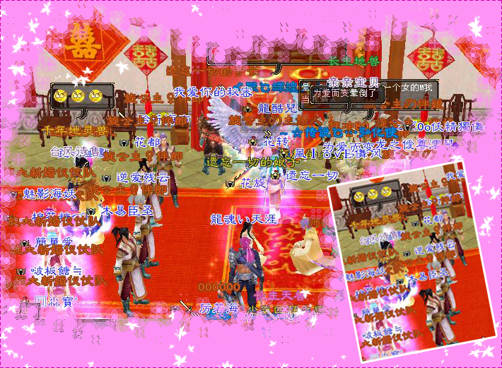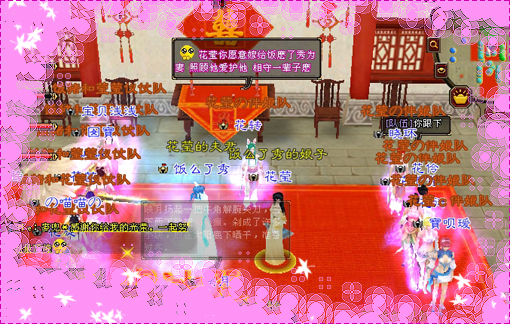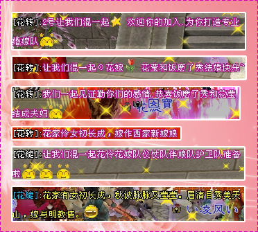 护卫队:由6个男孩子组队而成(人多的时候有2队,一队为伴郎队),前期统一有58级的紫色衣服,后来都弄丢了就买蓝色布衣,负责拜堂时维持秩序、清场(要求来宾收bb,让出红地毯),游街的时候跟在新郎的旁边
