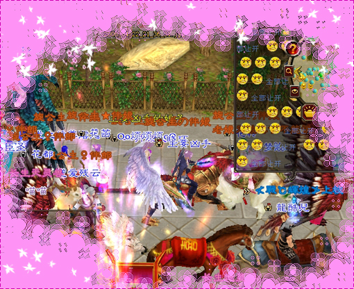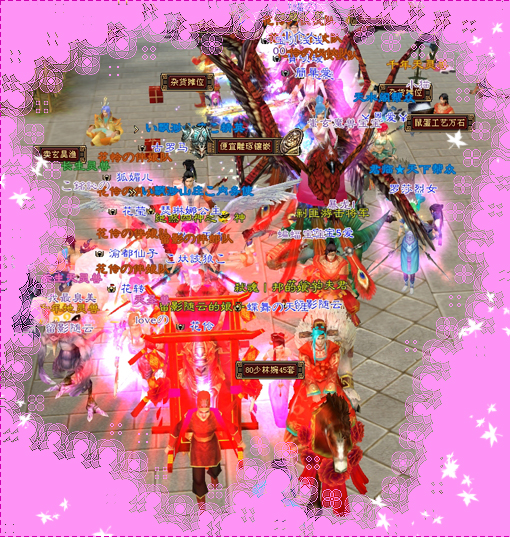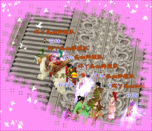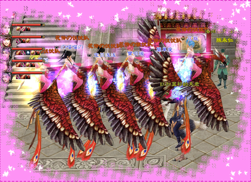 仪仗队:由6个女峨眉组队而成(人多的时候有2队),统一穿高级峨眉时装,手拿发光宫扇,红凤凰坐骑,负责为新人队伍增添美景