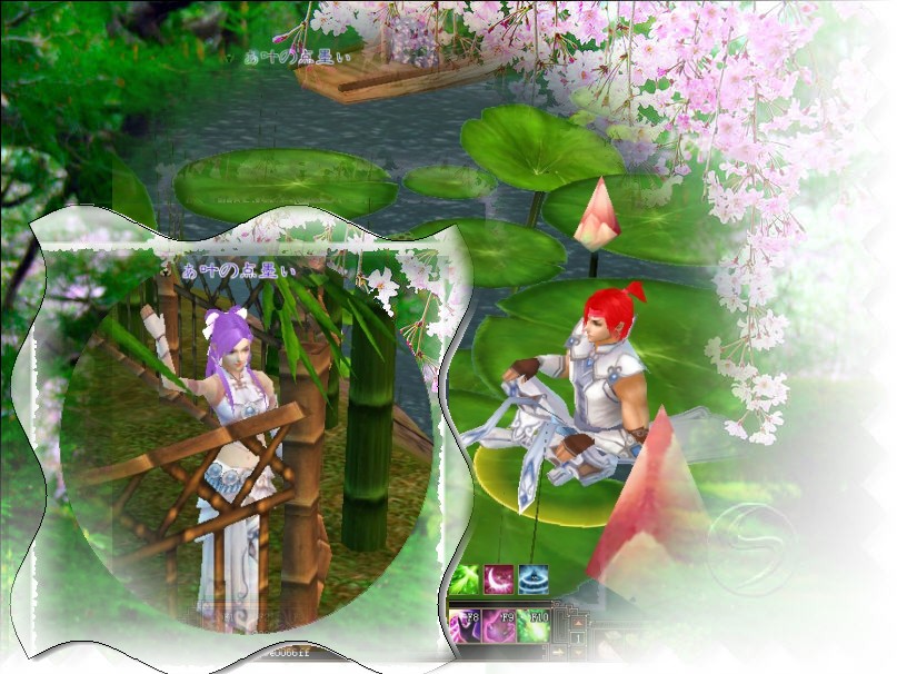 飛樰由于现实比较忙,所以游戏上线不多,上线的时间不是弄装备,就是去打架。而在我们结婚那天,相公竟然破天荒的陪我去过了一次双人燕子坞,为了对相公有更深的了解,这次的采访就在燕子坞里面的荷叶上进行----