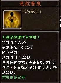 少林的技能,帮目标化解部分伤害。有点雷锋的味道,门派讨论区哀号一片,都觉得已经够烦恼了,还要把当炮灰进行到底,实在是可忍孰不可忍。我稍微提一下,这个技能提高了少林的人格魅力,几乎没有增强少林的单P能力,但是对于新副本作战,作用挺大,藏经阁副本即将是一大热门,副本中要保护一个武僧,该武僧不能靠峨眉加血,只能靠少林的拉和这个化解技能了。由于少林的人数不多,以后可能会呈现少林“打架不行,但副本没少林不行”的局面。