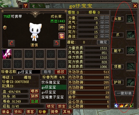 珍兽装备看更新说明是只开通界面,没开通实际装备。根据目前资料显示,珍兽装备应该是每10级更新一套,共5件,两件加内外防,两件加内外攻,一件加命中,不能强化镶宝石,目前看还是很单调。玩家或许更看重即将退出的装备能增强多少珍兽的能力,我稍稍计算了一下,带齐一套55级的装备对于95级左右的珍兽而言(以原始2000杰出内攻宝宝为例),大约为攻击增加5%,防御增加8%,命中增加18%,总体在8%系数的加成。我更希望来点套装,比如凑齐一套可以打珍兽第八技能等功能等等。