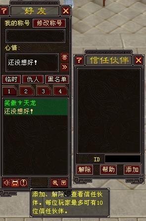 信任伙伴界面很简单,类似于“屏蔽列表”。每位玩家最多可以有10个信任伙伴,添加方法和为店铺添加合作伙伴的方法一样,需要输入角色ID。但是,信任伙伴关系只有在添加3天后才能正式生效。
