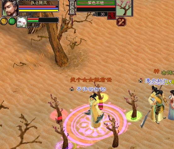 举个例子,我在敦煌升级时发现了这位正在挑战桃花阵任务(前世今生活动)的帅哥,我选中了他,也就是说,他是我当前的目标。那么我点击下他头像下面的这个按钮之后,我的目标则自动变更为“紫色木桩”。换句话说,通过这个操作,我了解到这位帅哥当前选中的目标是五个木桩中的“紫色木桩”,而且,切换之后,我的目标和他的目标是相同的了。