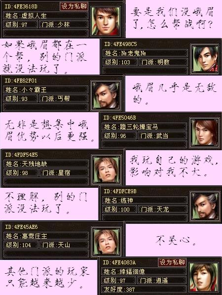 №老鬼№:可能很麻烦。(怎么讲?)如果峨眉都在一个帮,那别的门派就没法玩了。