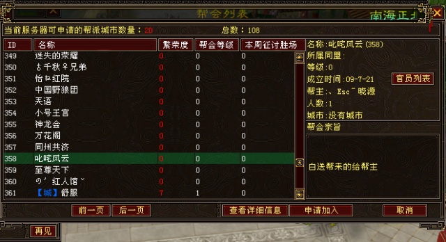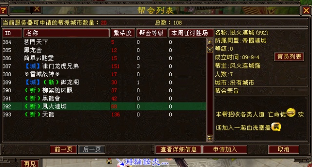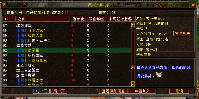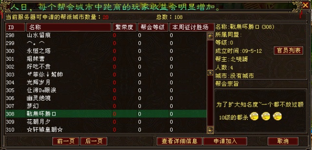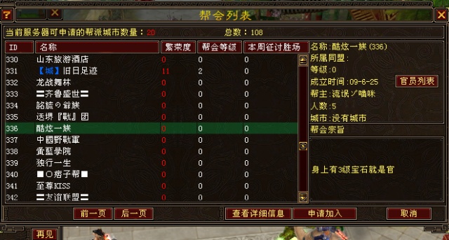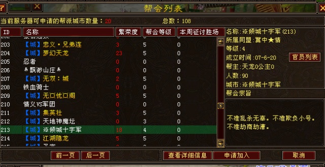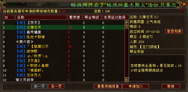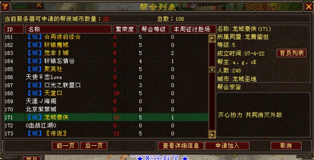 龙域豪侠;合区以后最大的生活帮,记得刷喇叭说过在线100人,为了对抗云天毅然放弃了安逸的生活帮本色,跟战神痞子组成了联盟,在于云天的战斗过程中,人气越打越旺,现在100级以上全五以上的玩家很多,形成了以慕容璞为代表的一大批超级打手,战斗经验日臻丰满,由于这个帮不侵犯一般帮派的利益,所以口碑良好.