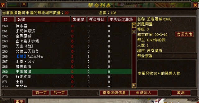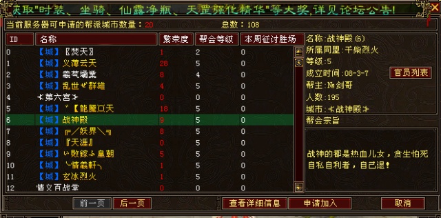 战神殿;老牌战斗帮,从第一任帮主为新区找老婆建帮之日,战斗就没停止过,帮里的成员个个骁勇善战,特别是现任帮主剑哥,据说从80多级就开始在战城上摸爬滚打,可谓**湖。