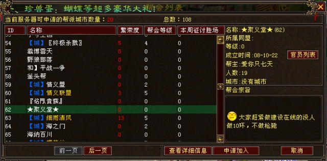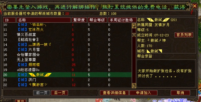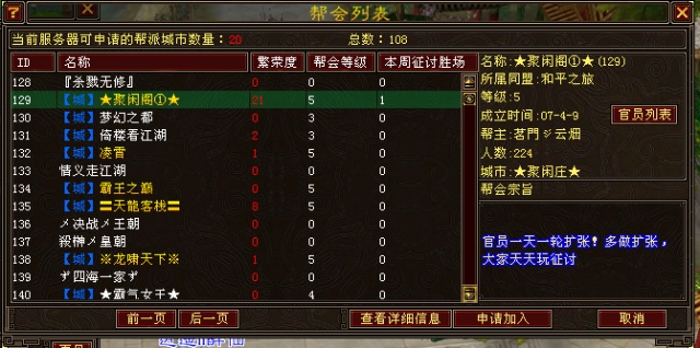 聚贤阁,合区前是塞外盘龙较大的帮派,合区后,喜欢PK的玩家大部分去了战神殿义薄云天等战斗帮派,现在这个帮特别喜欢征讨,帮里成员别的任务不喜欢做,扩张任务受欢迎。
