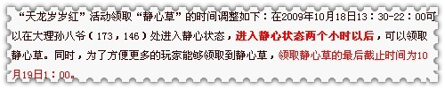 静心草,关键物品,在此次更新后改为进入静心状态2个小时以后才可以领取,而且领取时间截止为10月19日1:00……这点一定要注意哦,不然可就是前功尽弃!