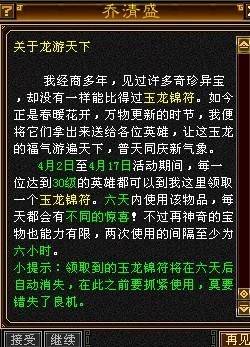 活动期间,30级以上的玩家前往洛阳(225,152)找到乔清盛,点击“龙游天下”获得道具“玉龙锦符”。“玉龙锦符”有效期为6天,右键使用道具,按照不同的有效期时间给予不同的道具奖励或任务,具体如下: