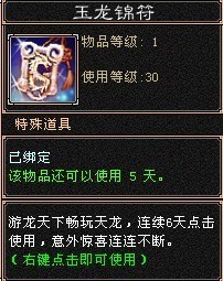 当”玉龙锦符”剩余时间为4-5天时,给予玩家使用后产生类似于神器技能效果的buff药水;