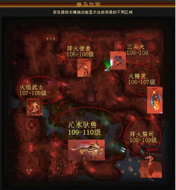 该场景南接大宛,北临练级副本----圣火宫(圣火宫场景详见【慕容小熊】的报道),因此撒马尔罕90级即可进入,里面的怪等级从105起步至110级。有6种,分别是拜火使者(105-106级)、火精灵(106-107级)、火焰武士(107-108级)、三头犬(108-109级)、拜火祭司(108-109级)、沁水驮兽(109-110级)。下面是怪物的大图:
