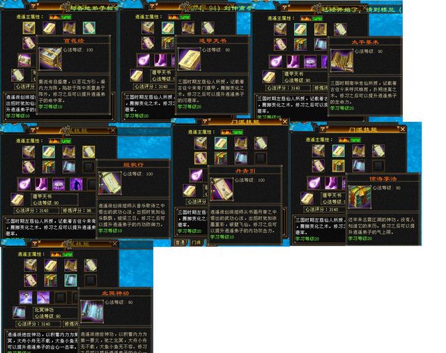 第一项:心法评分公式 心法评分=【第1本书心法等级】*2+【第4、5本书心法等级之和】*3+【第2、3、6本书心法等级之和】*6+【第7本书心法等级】*8