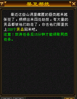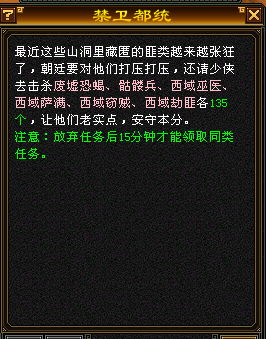 该任务共有三种类型:杀怪,杀怪寻物和定向杀怪。玩家可以在山洞中杀怪升级的同时领取“**诏令”任务,并在杀怪的同时完成任务,获得大量经验奖励。