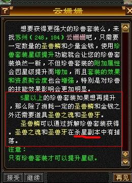 这两个道具可是珍兽装备由5升6必不可少的道具哦,下面我们来看看珍兽NPC云姗姗如何介绍这两个道具: