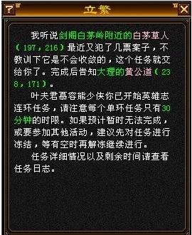 我接到的第一个任务是杀死一只剑阁的“白茅草人”(104级的人物竟然被支去打白茅草人,有点“大炮打蚊子”感觉),完成后到大理的“***”处交付,接取任务时系统开始30分种的倒计时,时间会显示在任务栏中,完成此环任务后获得经验81362。