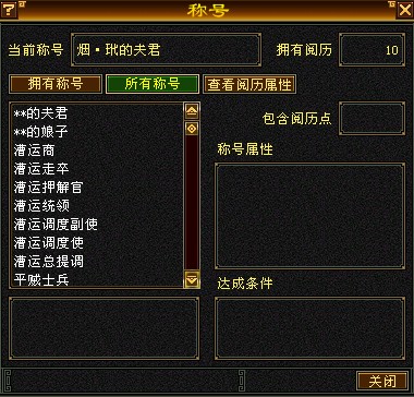 注意称号有2种功能,一个是顶着这个称号所蕴含的属性,还有是所蕴含的阅历,阅历这东西有点像潜能点,基本是日积月累。而蕴含属性这里就有点讲究,决定了你该顶哪个称号。