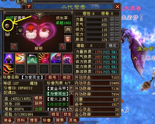 得到一只新宝宝却不知道该给它吃什么口粮,这个问题很好解决,打开珍兽界面,在左上角有个椭圆形的小图标(图中黄圈标注的位置),把鼠标停在那里旁边就会显示这只宝宝的口粮类型。如:鸳鸯的口粮是谷类。