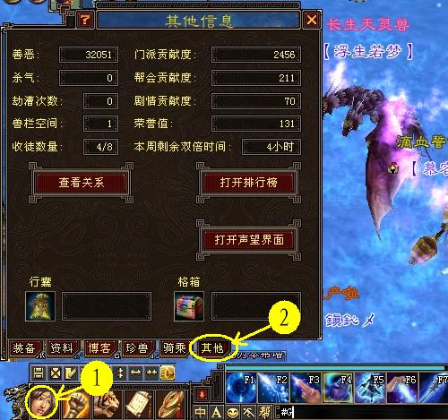 打开人物界面,选择最后一项“其他”,在这里你的门派贡献度、善恶值等一目了然。