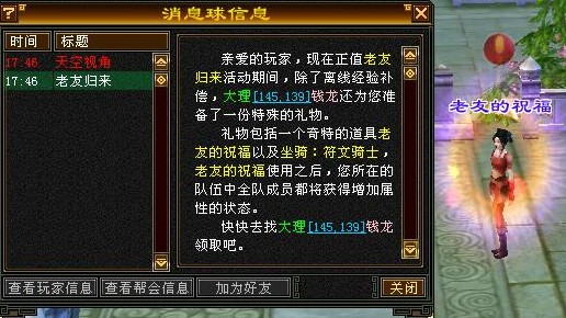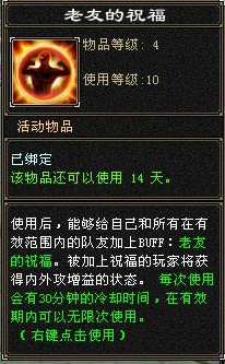 道具:老友的祝福使用之后的buff效果:基础内外攻增加20%,持续30分钟