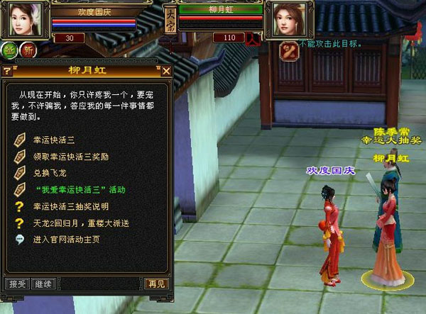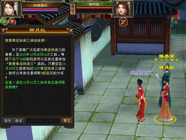 为了答谢广大玩家对幸运快活三的喜爱,在2010年10月23日24点之前,等级达到30级的玩家可以在我这里参加"我爱幸运快活三"活动。只要您在10月23日24点之前参加过15次幸运快活三活动,就可以来我这里领取丰厚的三级宝石奖励!