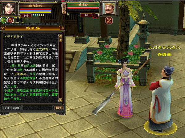 即日起至10月23日,每一位达到30级的英雄都可以到我这里领取一个玉龙锦符。六天内使用该物品,每天都会有不同的惊喜!不过再神奇的宝物也能力有限,两次使用的间隔至少为六小时。