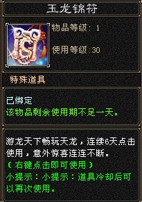 小提示:领取到的玉龙锦符将在六天后自动消失,在此之前要抓紧使用,莫要错失了良机。
