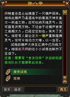 在活动期间,倘若您满足以下条件,就可以成功地接取到试炼的葫芦的活动任务: