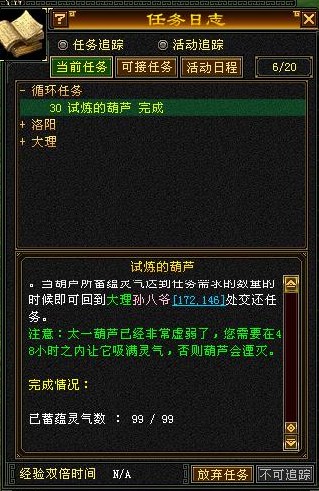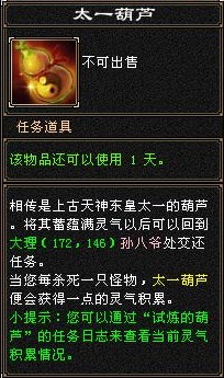 成功接取到任务以后,您会获得活动道具:太一葫芦。 每当您击杀一只和您等级相差不超过10级的怪物时,太一葫芦便会蓄蕴一点灵气。当葫芦蓄蕴的灵气点数达到任务需求的时候就可以回到大理(172,146)孙八爷处交还任务了。