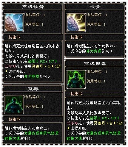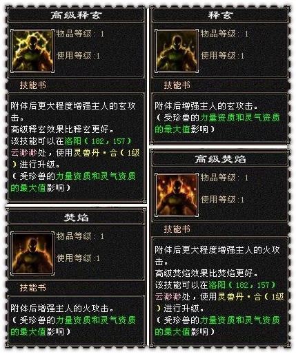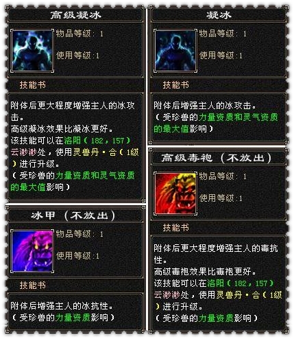 同时技能属性也做了小小的调整,原来凝冰、焚炎、释玄、聚毒(含高级)四种技能属性受珍兽的灵气资质影响,而这次则改成了受灵气、力量资质最大值的影响,