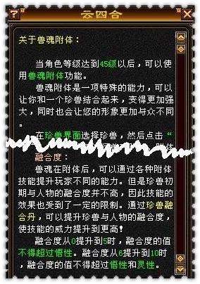 原来融合度的提升是无限制的,也就是说只要有足够的融合丹,一只白板宝宝可以从0一直提升到10。而这一次当小熊带着一只新出生的宝宝到苏州“云四合”处提升融合度的时候,云妹妹很温柔地提醒我“对不起,融合度的最大值不能超过悟性!”于是我查了一下提升规则,发现增加了以下限制条件:
