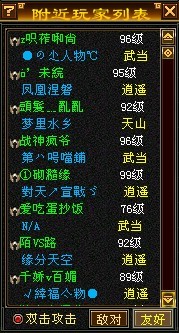 我见得比较多的是在非聊天模式下用QERZ这几个键位。但自动选择目标也有其弊端,就是随机切换目标。群P中这样的锁定设置甚至还不如鼠标点人,因为如果你老老实实选的话,可能你不是选到怪和BB就是永远选不到你想选的。于是乎,附近玩家列表应时而出。
