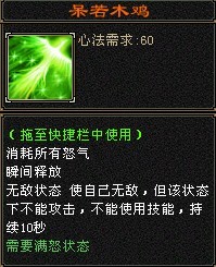 呆若木鸡,峨眉弟子的招牌逃命技能,木鸡后可以使用定位等回城,但是可以被围困技能所控制(画地之类),此时仍然是无敌状态,可以选择猥琐地下线,总之,当一个峨眉木鸡使用出来并且他决定宁愿猥琐也不愿意倒下的时候,基本就对他无可奈何了。在一大批敌人中潇洒的掏出回城或者下线消失,令敌人捶胸顿足,后悔没打了峨眉的怒。