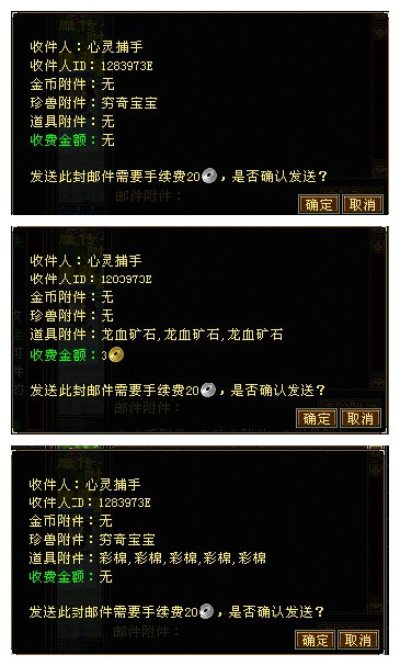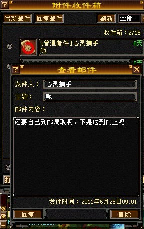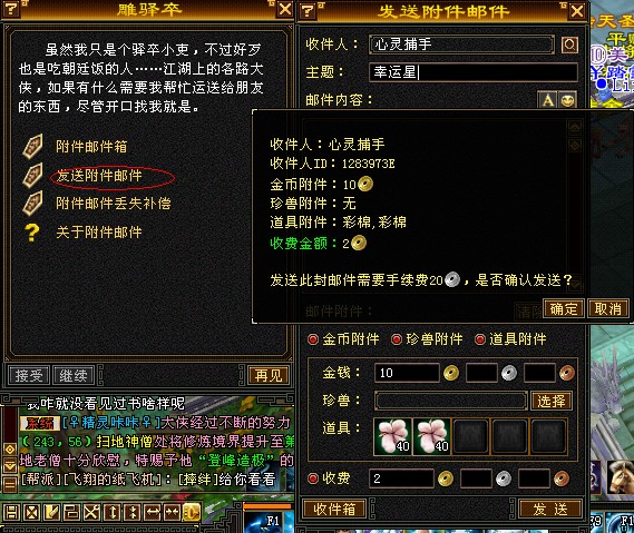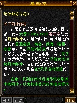 PS:每人每天最多只能发送10封邮件,若发送的有附件的邮件没有被接受,7天后自动回退给寄信者。收费的附件邮件,若收件人没有购买次收费邮件,附件中的物品会在1天以后退还。
