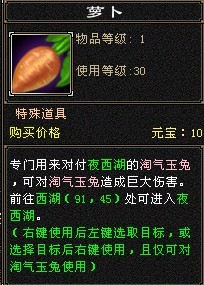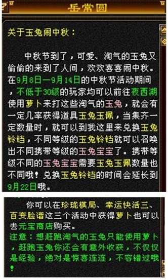 2011年9月8日—2011年9月14日中秋节活动期间,不低于30级的玩家可以前往夜西湖用萝卜喂淘气的玉兔,就会有几率获得玉兔玉佩,当集齐一定数量时,在苏州岳常圆(192,148)处兑换玉兔铃铛。