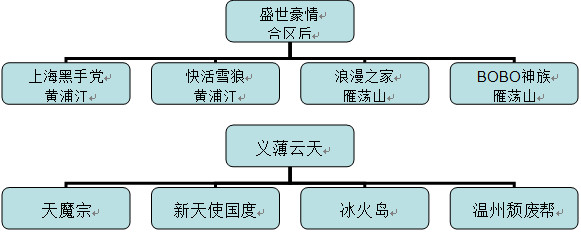 自从黄浦江、雁荡山合区之后,江湖上形成了两大PK势力:义薄云天(天魔宗、冰火岛、新天使国度、温州颓废帮等),盛世豪情(浪漫之家、BOBO神族、上海黑手党、快活雪狼等)。下面贴上合区前后两大PK势力的形势图