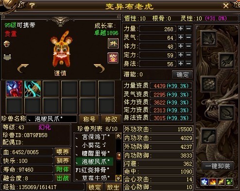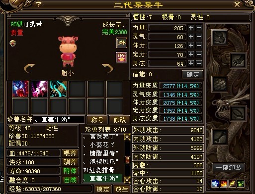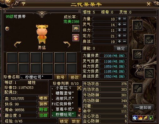 那时候刚出附体宝宝,全区都没什么人做,LZ也不懂这玩意儿,就听说成长很重要,以为是完美就行了,根本不懂什么2388,2035,1900之类的