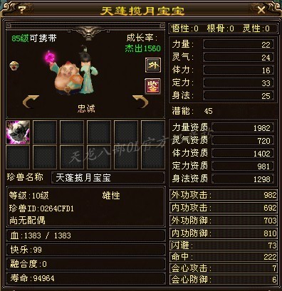 1314枚情人结可兑换珍兽笼:天蓬揽月(可孵化出一雌一雄,携带等级5级-85级的外功攻击型宝宝)