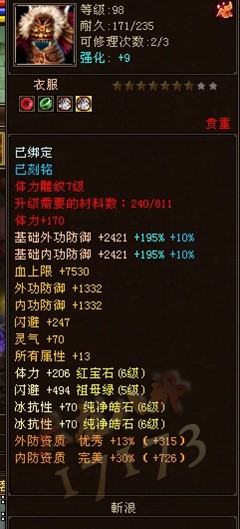 首先感谢大家能停下脚本看一下本人的一点对武当的感慨。本人全国网通一区气吞山河的第一武当,曾经在论坛上也有过很多关于区内的争议。那么经常看论坛上无数的玩家为武当的脆弱而伸冤鸣苦,其实我是这么看待武当的具体如下。首先说一下本人的装备,本人全身除去减抗有部分是5级石头以外,其余全是6级