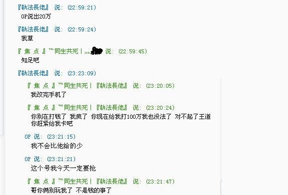 这是执法长老和我的聊天,当时账号已经交易给了平少,平少的十万块钱已经到账,王道的十万块钱是第二天早晨还给他的,王道真的疯了,最后喊出了二十万,不过已经晚了。