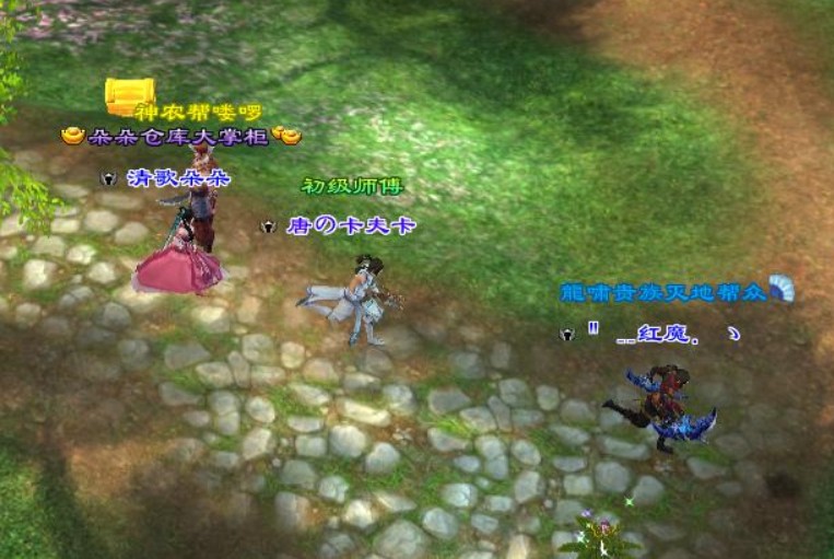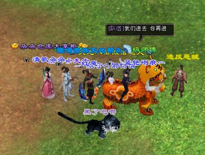 呼朋引伴共游之,迅速集合好天龙客栈的小伙伴们,刷反可谓是新手阶段一夜暴富的最佳途径。看,前方跑得欢腾的小2B便是以八卦爆料著称的游久当红娱记“苏子墨”;后方一身“**大娘装”(请允许我如此评价内测峨眉时装……)便是朵朵大掌柜;伪“高富帅”某卡手持弓弩严阵以待,再次省略感谢XX新手时装卡的大力赞助几万字!!