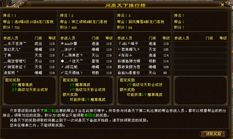 问鼎天下第二轮中排名第一的帮会所有等级在85级以上的玩家还可以在凤鸣镇(158,45)周倚天处领取一个至尊王者礼包。