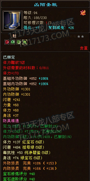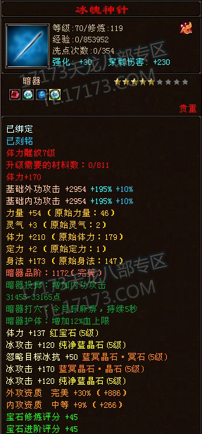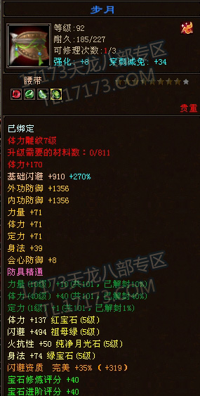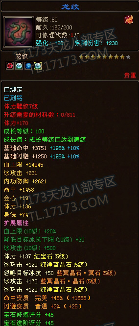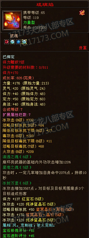 LZ是个满5天山,带有几块4级抗,7雕纹,万宝之后1100的忽略,全身法加点,血量还不错,属性相对也不低,砍人也很爽。可惜只有10个冥晶石,真元暂时差不少事,孩子装备有待提星,穿刺也才2200,关键是想换装备,无奈本区几乎没有做装备的专业玩家,好郁闷。。。。。