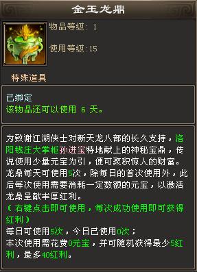 2014年5月29日更新维护后至2014年6月4日23:59,角色等级≥15级的玩家只要登录游戏,可点击技能栏上方的活动图标,免费领取一只“金玉龙鼎”,右键点击“金玉龙鼎”,即可获得红利奖励!每个玩家每天可使用“金玉龙鼎”的次数为5次,每日首次使用完全免费!详情请点击》