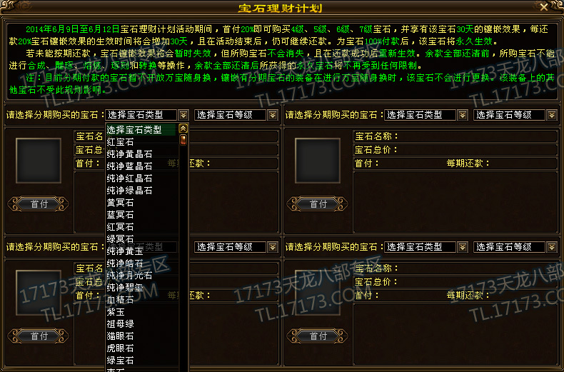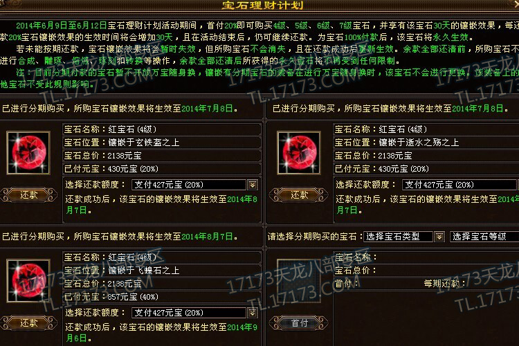 宝石理财计划详述:在活动期间,凡事等级达到15级的玩家均可通过分期付款的方式来购买4级及以上的宝石,(每人仅限购买4个)通过分期付款购买石头时,首付只需付宝石价格的20%即可,宝石镶嵌效果生效日期为30天,但还款越多,增加的生效期越长,已分期购买的石头不限制还款的日期。直到全部金额还款结束,宝石将永久拥有。