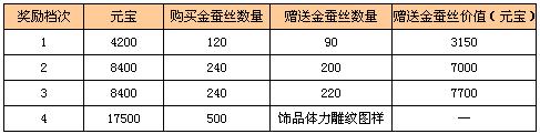 为感谢玩家的厚爱,我们对原“消费元宝金蚕丝免费领”活动进行了调整,升级为“金丝献礼”活动。2014年9月1日更新维护后至9月7日24点活动期间,等级≥15级的玩家可以点击头像下方的“金丝献礼”按钮参与活动。在活动界面购买金蚕丝(绑定),即可额外获赠价值不菲的金蚕丝(绑定)或饰品体力雕纹图样。奖励档次如下: