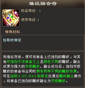 2014年9月1日更新维护后,玩家可以通过洛阳(318,315)雕纹大师张降龙,使用一张雕纹融合符,将已蚀刻于装备上的雕纹,与另一个可蚀刻于该装备且颜色不同的雕纹进行融合,进化成为双极雕纹。