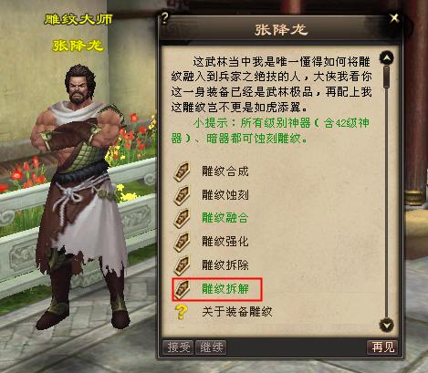 2014年9月1日更新维护后,玩家可以通过洛阳(318,315)张降龙,将2至10级的雕纹拆解成金蚕丝,拆解时仅需要消耗一定数量的元宝,即可获得雕纹当前等级花费的全部金蚕丝,且没有任何金蚕丝的损耗(雕纹图样、黄纸、丹青不返还)。详情请点击》